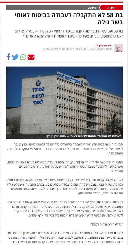 "מוסד הביטוח לאומי פעל במקרה זה בניגוד לחוק שיוויון הזדמנויות בעבודה כאשר מנע מהתובעת להתקבל למקום עבודה רק בשל גילה"